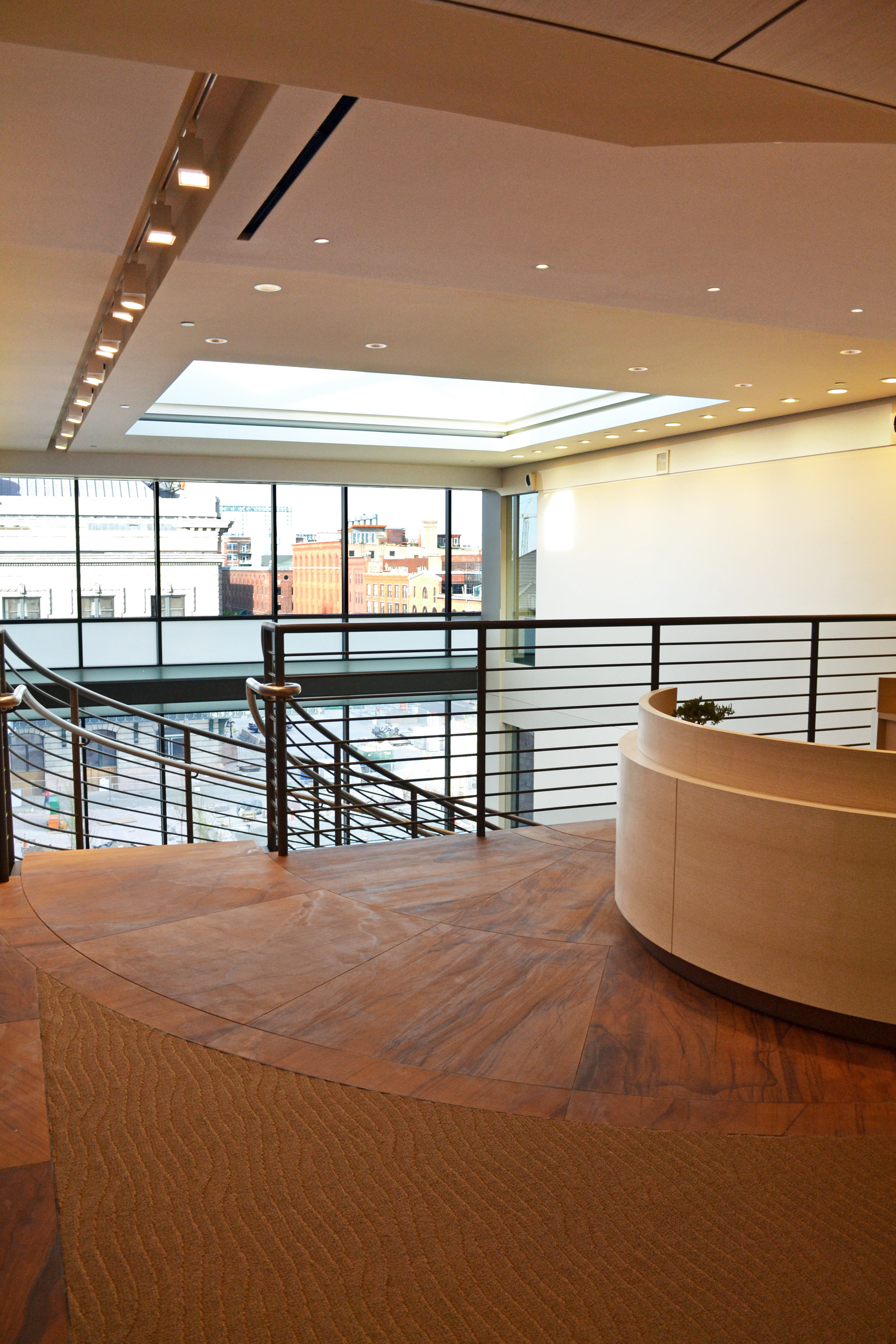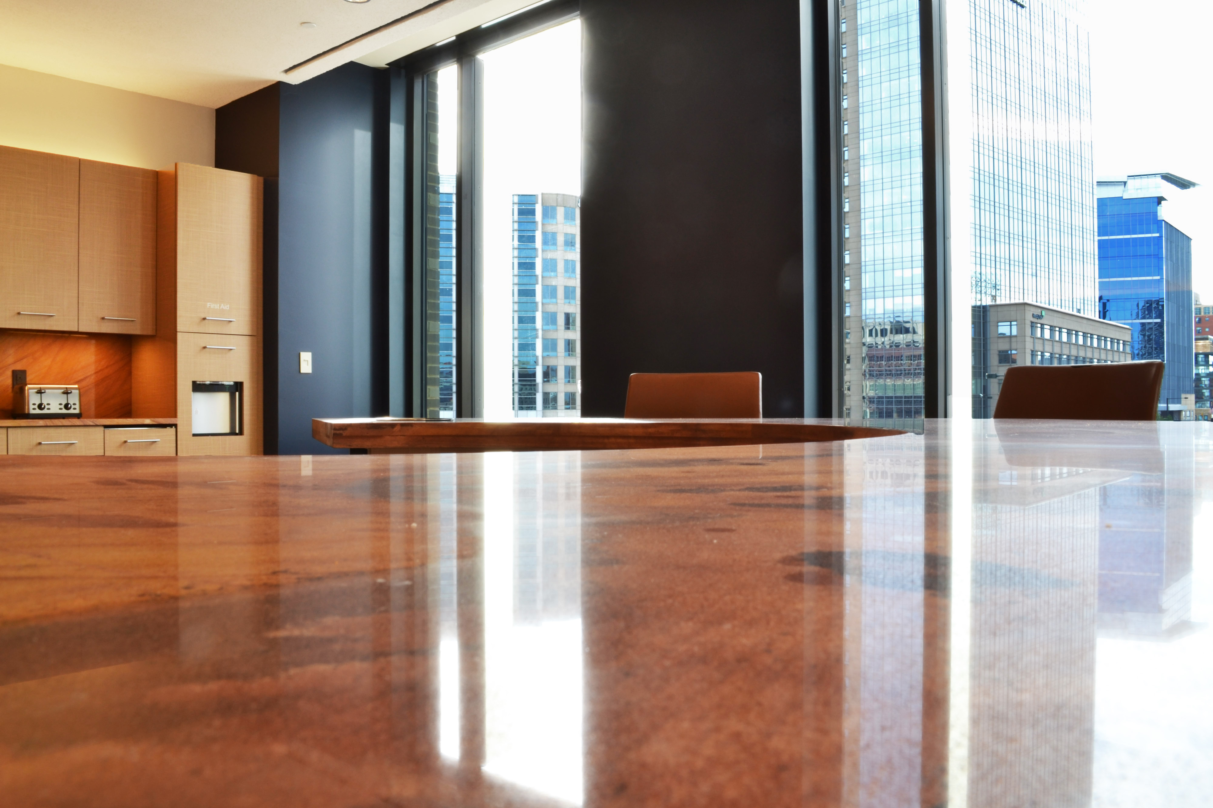 Stone table top and backsplash in an office with chairs